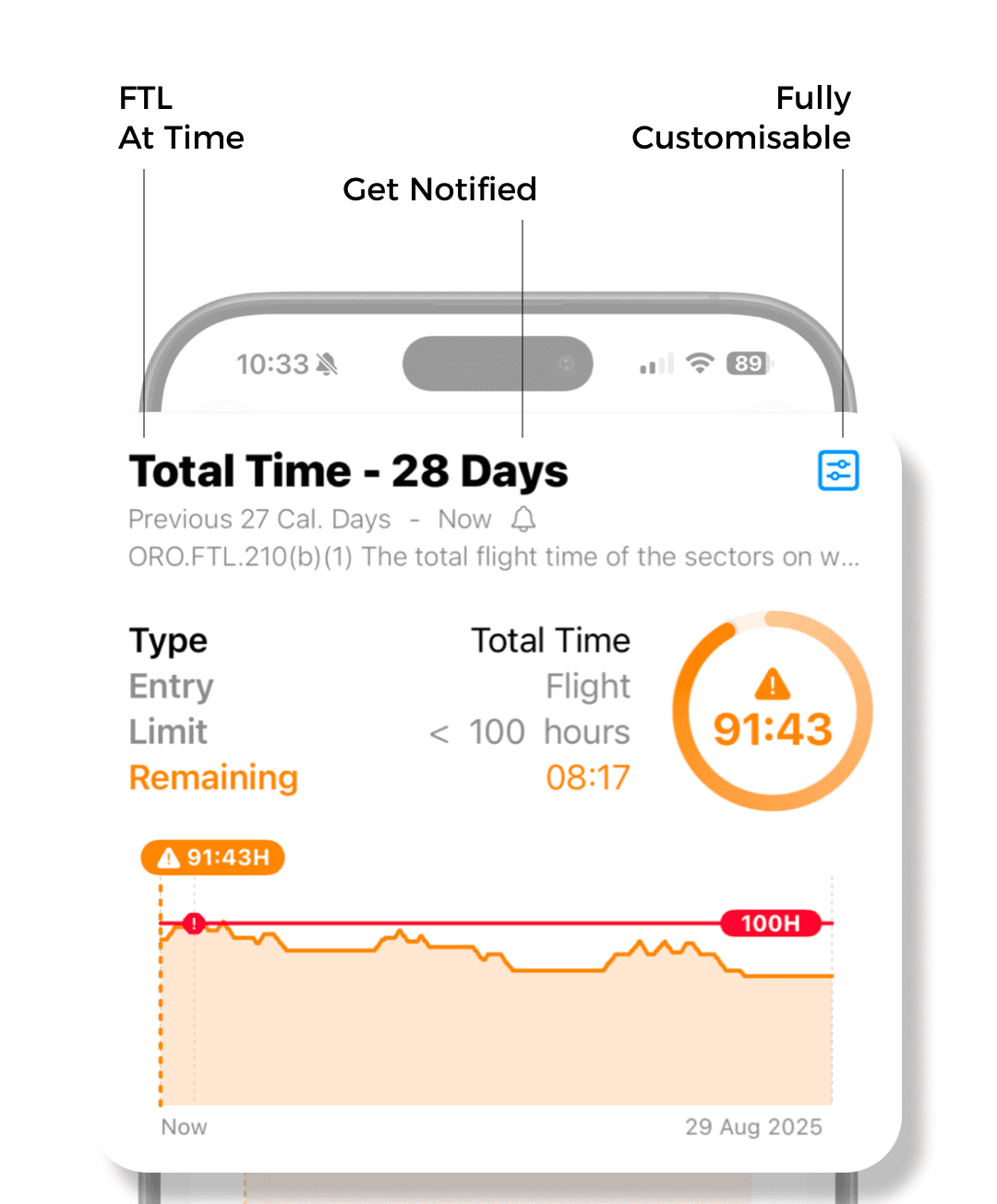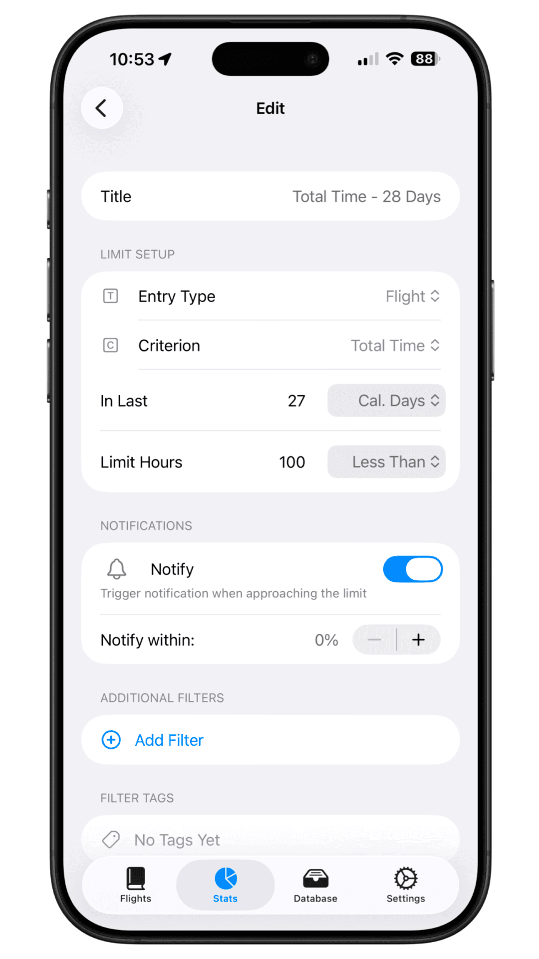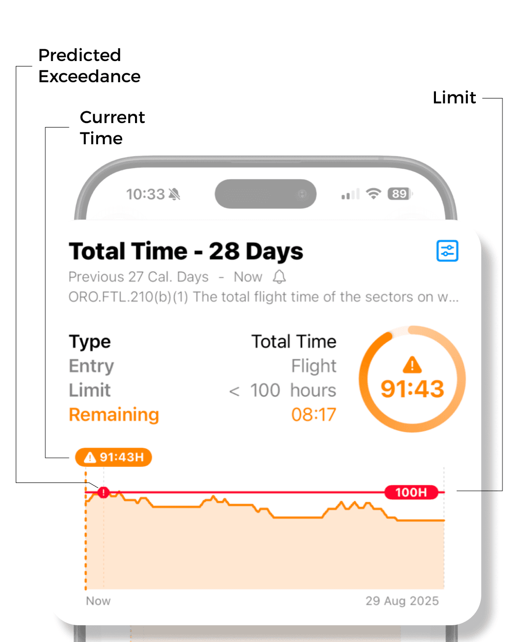 You can display chart for each limitation by tapping on the limit cell. The chart displays cumulative time / count for selected time frame. The current time is always in the centre of the x axis. Future flights, if logged, will display on the right of "NOW" showing you, if you might go over the limit.